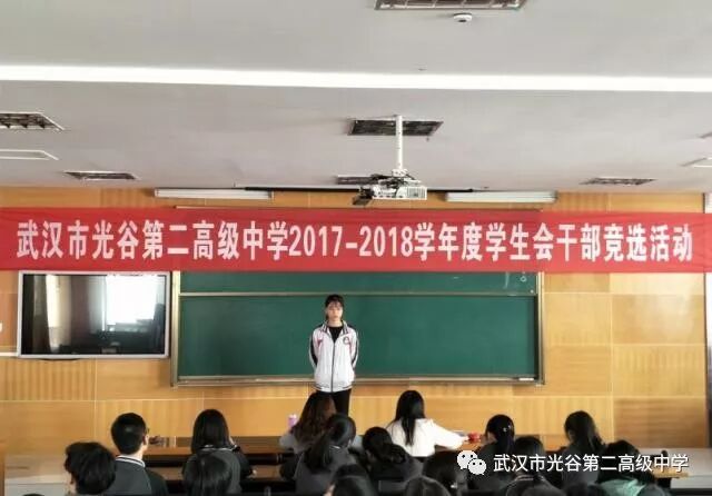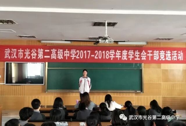 我校学生会设有学习部、文艺部、宣传部、权益部、体育部、纪检部六大部门,本次竞选活动主要竞聘职位为主席团和六大部门部长。前期,上一届学生会干部深入高一各班进行了广泛的宣传和动员,各班主任也进行了积极推荐,最终共有付紫晗、李能屹等40余位同学进入了面试竞选环节。本次竞选主要以演讲形式进行,每位竞选人从个人介绍,加入学生的目的和对竞选岗位的工作设想等几方面展开。演讲中,竞选人言谈举止中流露出对学生会工作的真挚渴望及敢于挑战自我的信心,展现出了良好的素质和修养,体现了光谷二高学子敢于挑战自我的信心和勇气。 秉承着公开竞争、公平考核、择优录用的原则,最终王雨、李全等12位同学入围。此次竞选为高一新生提供了一个展现自我、挑战自我的平台,同时也为我校学生会注入了新鲜的血液。相信在新一届学生会干部的带领下,学生会能够更有效的开展学生活动,更用心的服务同学。